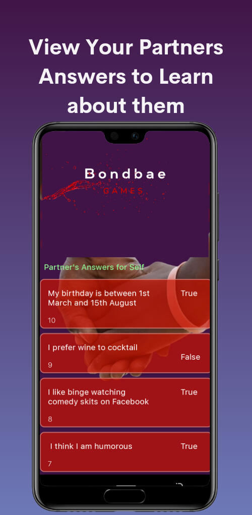 Bondbae games is a couples games to strengthen relationships in a fun way.The more you play this fun relationship game, the more you get to improve intimacy with your partnerBondbae Games is based on a True or False relationship quiz for couples which can also be played by two friendsYou answer True or False to fun and intriguing questions about each other and get a score rating of how well you know your partner based on your answersThis relationship quiz features intriguing questions on topics around your preferences, ideology, romance, lifestyle, personality and of course sex!!